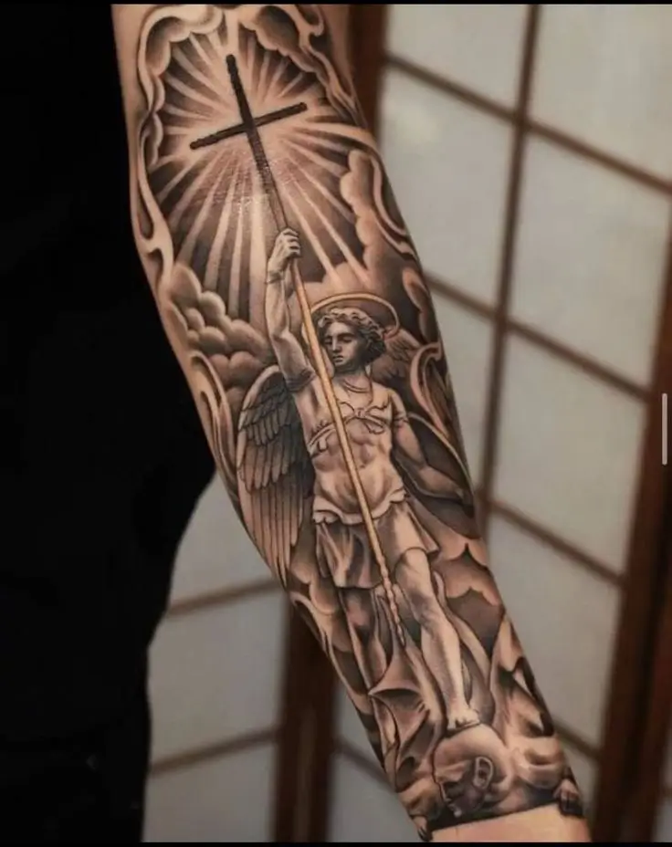 Some people like to wear their beliefs on their skin. We’re fans of focusing on not only the battle between light and dark in the subject matter, but also using lots of highlights and dark shadows in these tattoos to add extra depth.