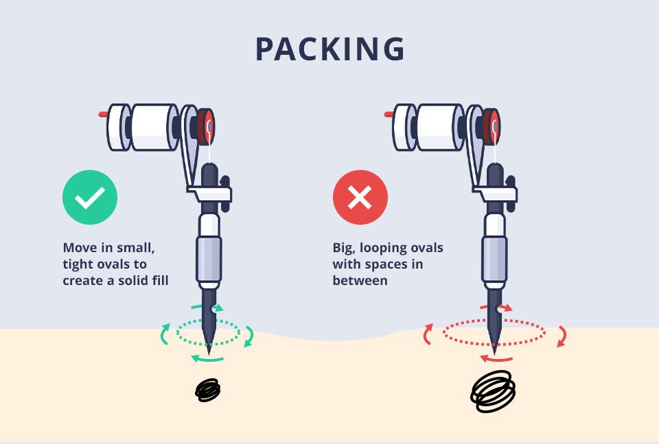 - How to do it: Move the needle in tight oval motions over the skin. (Some artists prefer to say “circular motion”). Make sure pressure on the needle is not heavier on one side of the needle.